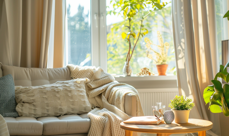 커튼, 러그, 쿠션 등 소품을 고를 때는 심플한 패턴이나 단색 제품을 추천합니다. 복잡한 패턴이나 강렬한 색상의 소품은 시선을 분산시켜 공간을 더 좁아 보이게 만들 수 있습니다. 일관된 색감과 디자인을 유지하면 집이 훨씬 정돈되고 넓어 보이는 효과를 얻을 수 있습니다.