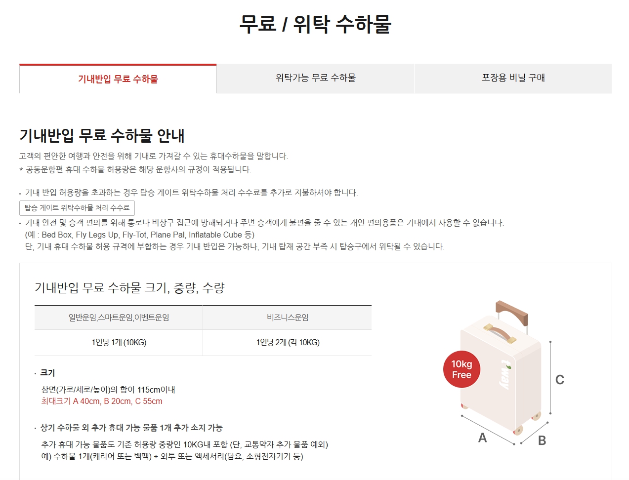 - 크기: 가로 40cm × 세로 20cm × 높이 55cm 이하 (삼면의 합이 115cm 이하)